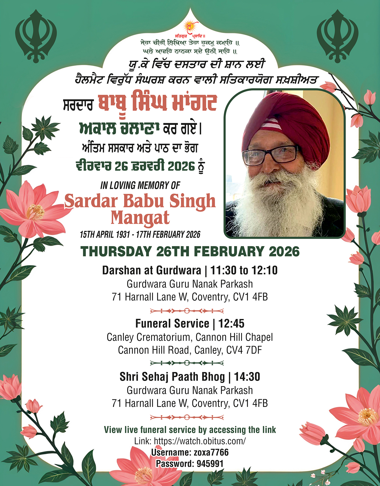 ਯੂ.ਕੇ ਵਿੱਚ ਦਸਤਾਰ ਦੀ ਸ਼ਾਨ ਲਈ ਹੈਲਮੈਟ ਵਿਰੁੱਧ ਸੰਘਰਸ਼ ਵਿੱਚ ਜਿੱਤ ਪ੍ਰਾਪਤ ਕਰਨ ਵਾਲੀ ਸਤਿਕਾਰਯੋਗ ਸਖ਼ਸ਼ੀਅਤ ਸਰਦਾਰ ਬਾਬੂ ਸਿੰਘ ਮਾਂਗਟ ਨੂੰ ਭਾਵਭਿੰਨੀ ਸ਼ਰਧਾਂਜਲੀ
